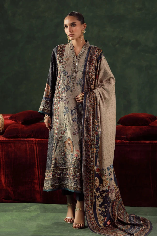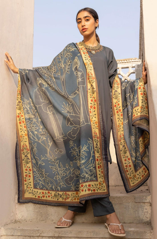 Dur-e-fishan Shawl, made using herringbone, is a double-sided shawl that features the words of Jigar Moradabadi calligraphed throughout.